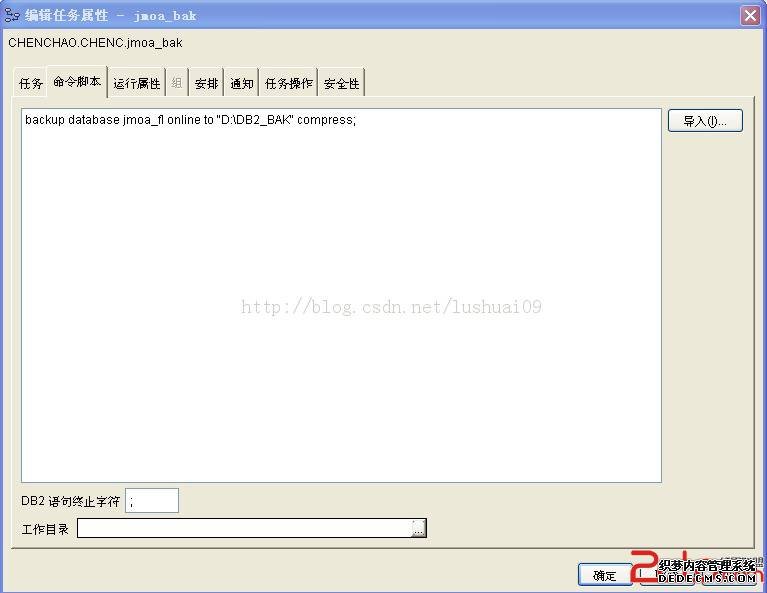 意思是把oa程序包文件进行压缩并存储到d:\DB2_BAK目录下,注意本例中e:\DAJ_OA\Tomcat5.0\jmoa为oa的程序包目录,各个单位的目录或许有差异,请根据实际路径修改,同样把此bat文件加到计划任务里则可以完成oa文件的自动备份。