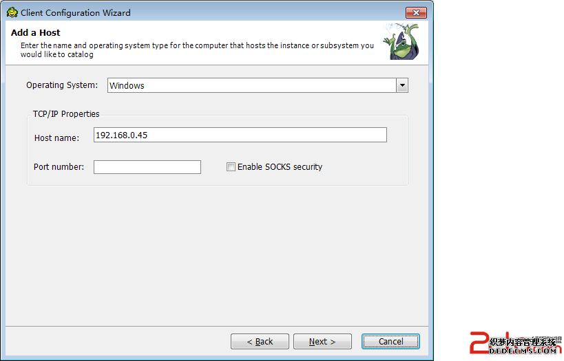4 选择操作系统Opeartion System(windows) TCP/IP设置:主机名称Host name:172.16.17.7(安装DB2的服务器IP) 端口号Port Number:50000