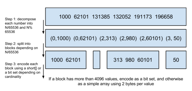 程序员的世界里除了1024外,65535也是一个经典值,因为它=2^16-1,正好是用2个字节能表示的最大数,一个short的存储单位,注意到上图里的最后一行“If a block has more than 4096 values, encode as a bit set, and otherwise as a simple array using 2 bytes per value”,如果是大块,用节省点用bitset存,小块就豪爽点,2个字节我也不计较了,用一个short[]存着方便。