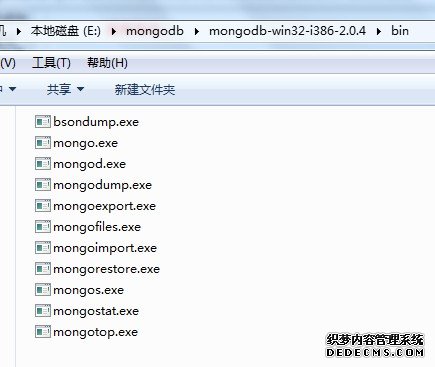 3.2)新建目录E:\ mongodb , 将下载的压缩包解压到此目录。bin文件夹下有一堆.exe 文件