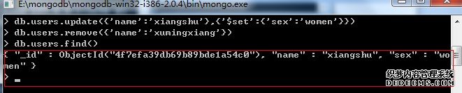 从输出的界面我们看到现在只剩下一条'name'为'xiangshu'的了,并且它的'sex'为'women',这说明4)5)两步操作成功了。