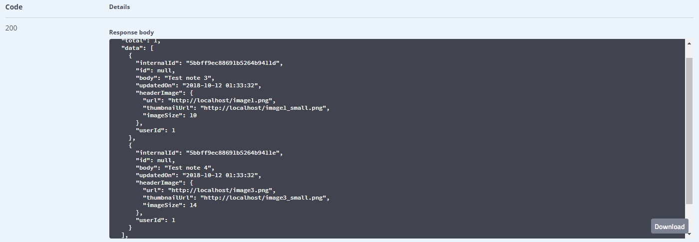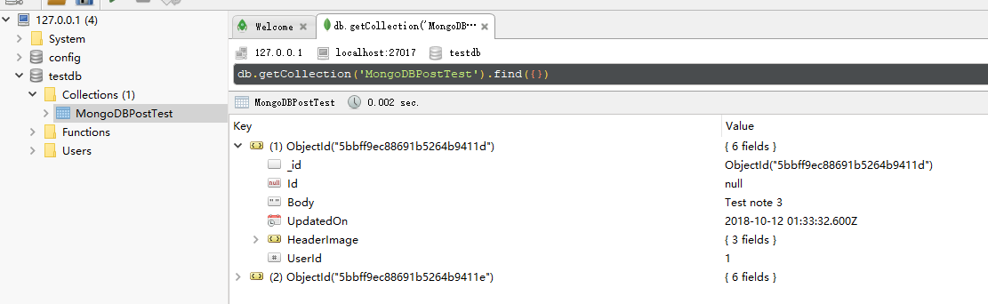 public class MongoDBPostTest { [BsonId] // standard BSonId generated by MongoDb public ObjectId InternalId { get; set; } public string Id { get; set; } public string Body { get; set; } = string.Empty; [BsonDateTimeOptions] public DateTime UpdatedOn { get; set; } = DateTime.Now; public NoteImage HeaderImage { get; set; } public int UserId { get; set; } = 0; } public class NoteImage { public string Url { get; set; } = string.Empty; public string ThumbnailUrl { get; set; } = string.Empty; public long ImageSize { get; set; } = 0L; }MongoDBPostTest