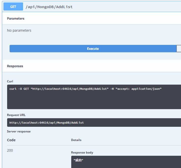 [Produces("application/json")] [Route("api/MongoDB/[action]")] public class MongoDBController : Controller { private readonly MongoDBBase _context = null; public MongoDBController(IOptions<Settings> settings) { _context = new MongoDBBase(settings.Value.ConnectionString, settings.Value.Database); } [HttpGet] public IActionResult AddList() { List<MongoDBPostTest> list = new List<MongoDBPostTest>() { new MongoDBPostTest() { Id = "2", Body = "Test note 3", UpdatedOn = DateTime.Now, UserId = 1, HeaderImage = new NoteImage { ImageSize = 10, Url = "http://localhost/image1.png", ThumbnailUrl = "http://localhost/image1_small.png" } }, new MongoDBPostTest() { Id = "3", Body = "Test note 4", UpdatedOn = DateTime.Now, UserId = 1, HeaderImage = new NoteImage { ImageSize = 14, Url = "http://localhost/image3.png", ThumbnailUrl = "http://localhost/image3_small.png" } } }; try { _context.InsertMany(list); } catch (Exception ex) { throw; } return Ok("成功"); } [HttpGet] public Result<List<MongoDBPostTest>> SelectSingle() { //无条件 var list = _context.GetList<MongoDBPostTest>(); //有条件 //var list = _context.GetList<MongoDBPostTest>(a => a.Id == "1"); //得到单条数据,无条件 //var list = _context.GetSingle<MongoDBPostTest>(); //得到单条数据,有条件 //var list = _context.GetSingle<MongoDBPostTest>(a => a.Id == "3"); ObjectId internalId = _context.GetInternalId("5bbf41651d3b66668cbb5bfc"); var a = _context.GetSingle<MongoDBPostTest>(note => note.Id == "5bbf41651d3b66668cbb5bfc" || note.InternalId == internalId); return ResHelper.Suc(1, list, "成功"); } }MongoDBController