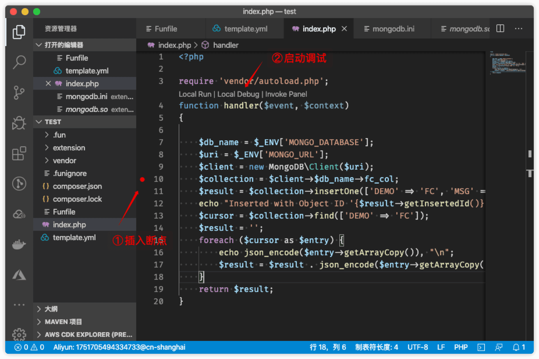 本文主要介绍如何结合 fun install 和 fun local invoke 进行附带 extension 的 PHP 项目开发和调试。Funfile 文件可以描述 extension 的安装命令,如果您有 Dockerfile 的使用经验,那你会发现两者使用体验非常类似。虽然这里只举了一个 mongodb 的示例,但是这个示例是比较完整的,对于其他类似需要安装 PHP extension 的场景也同样适用。