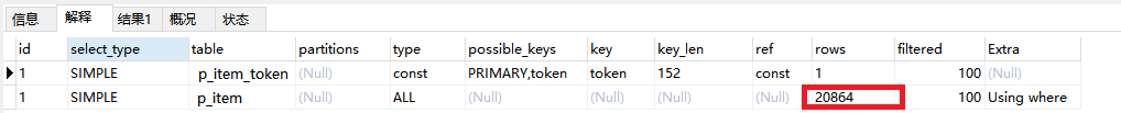 注意看上面大红框。p_item表中就是2w条数据,那这个就是全表扫描了。