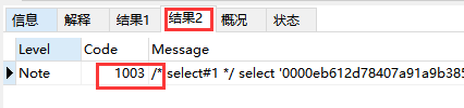 结果2里面显示code=1003.后面有个sql语句。这个语句就是mysql把我们输入的sql语句,按照规则改写之后执行的最终语句。