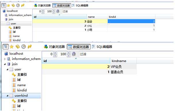 INSERT INTO `user` VALUES (1,'小明',1),(2,'小红',1),(3,'涵涵',2);插入一些数据到 userkind表