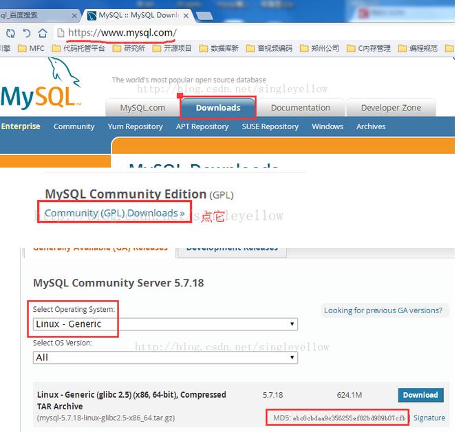 1、下载MySQL:官网https://www.mysql.com/,点击Downlosas,翻到网页底部,下载社区版,一路点下去,选择通用Linux,下载64位那个,注意检查MD5