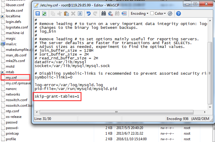 安装之后会在etc下生成一个my.cnf文件,在my.cnf中加入一个skip-grant-tables = 1配置,跳过初始化密码验证要求。
