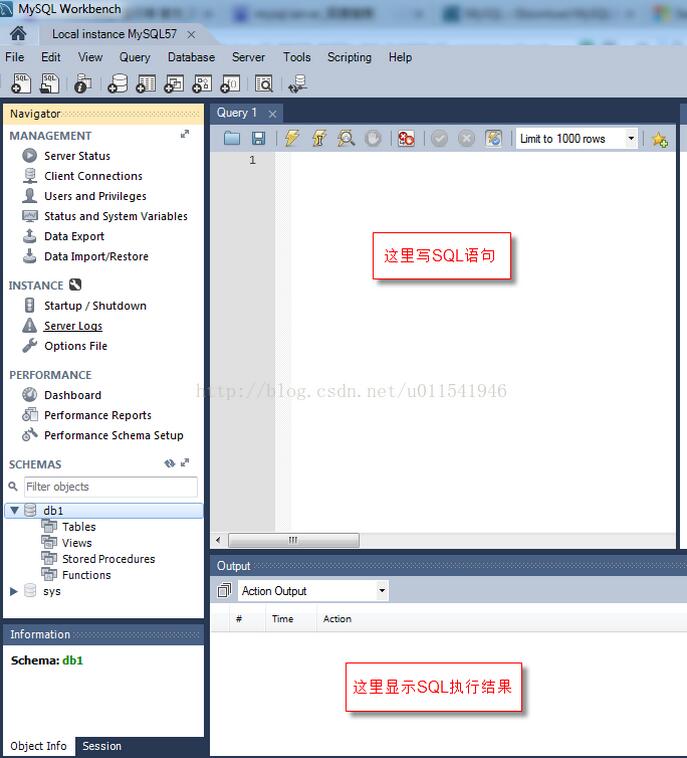 上图中db1是我们新建的数据库,sys是MySQL Server安装完后,默认的一个数据库。以后我们都用MySQL Workbench来连接我们数据库,然后手动或者SQL语句去创建表等相关数据,整体界面如下。