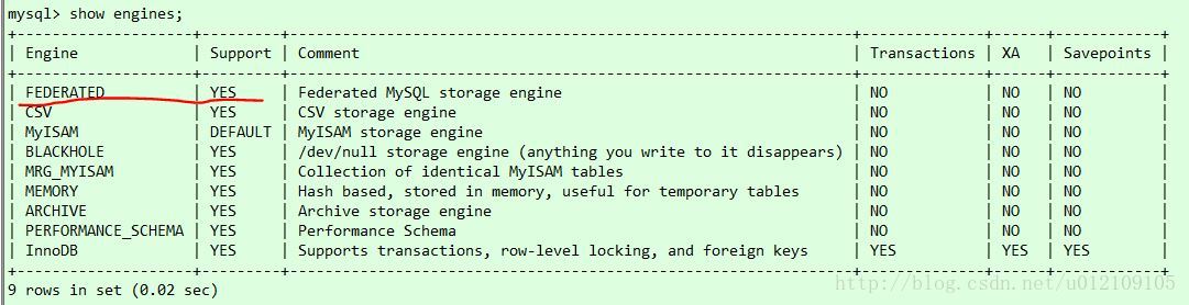 前提条件:你的mysql得支持federated引擎(执行show engines;可以看到是否支持)。