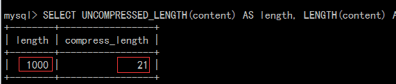 复制代码 代码如下:SELECT UNCOMPRESSED_LENGTH(content) AS length, LENGTH(content) AS compress_length, UNCOMPRESS(content), content FROM `test`.`test_compress`