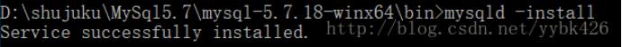 6.执行安装服务:mysqld -install,安装成功会看到:Service successfully installed