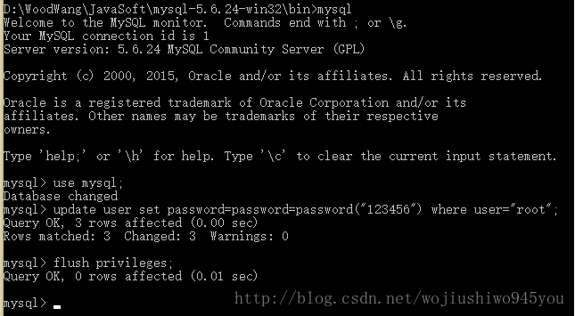 关闭MySQL服务:net stop MySQL 以管理员身份打开cmd控制台窗口,进入MySQL所在目录的bin目录,执行mysqld --skip-grant-tables 再另开一个cmd窗口直接执行mysql命令(由于2操作已经是无需授权即可访问表,所以直接用mysql,不带用户名和密码即可登录) 切换到mysql数据库:uses mysql; 修改user表的password字段: update user set password = password ( ‘123456' ) where user = ‘root'; 执行刷新操作:flush privileges; 退出mysql:quit; 重启MySQL服务:net start MySQL