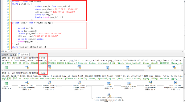 下面是类似案例在sqlserver 2014中的测试,几万完全一样的测试表结构和数量,可见这种情况下,两种写法,在SQL Server中可以认为是完全一样的(执行计划+效率),这一点SQL Server要比MySQL强不少