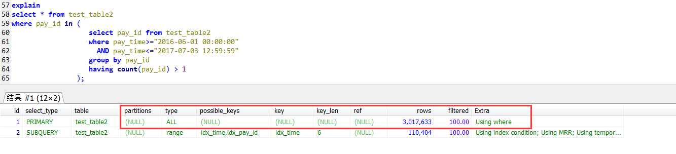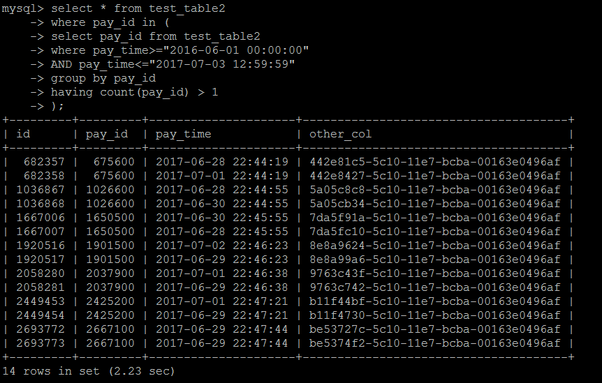select * from test_table2 force index(idx_pay_id) where pay_id in ( select pay_id from test_table2 where pay_time>="2016-06-01 00:00:00" AND pay_time<="2017-07-03 12:59:59" group by pay_id having count(pay_id) > 1 );