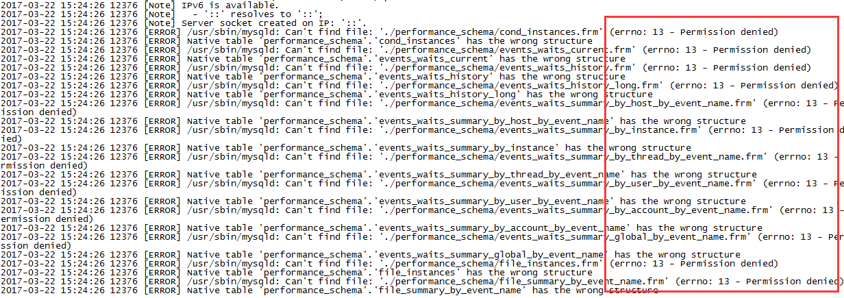 cd /var/lib/mysql/performance_schema chown mysql * chgrp mysql *