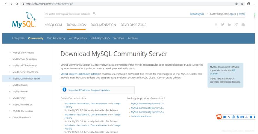 登录mysql官网(https://www.mysql.com/)-->Downloads(最上面)-->community(Downloads下面)-->MySQL Community Server(最左边)-->
