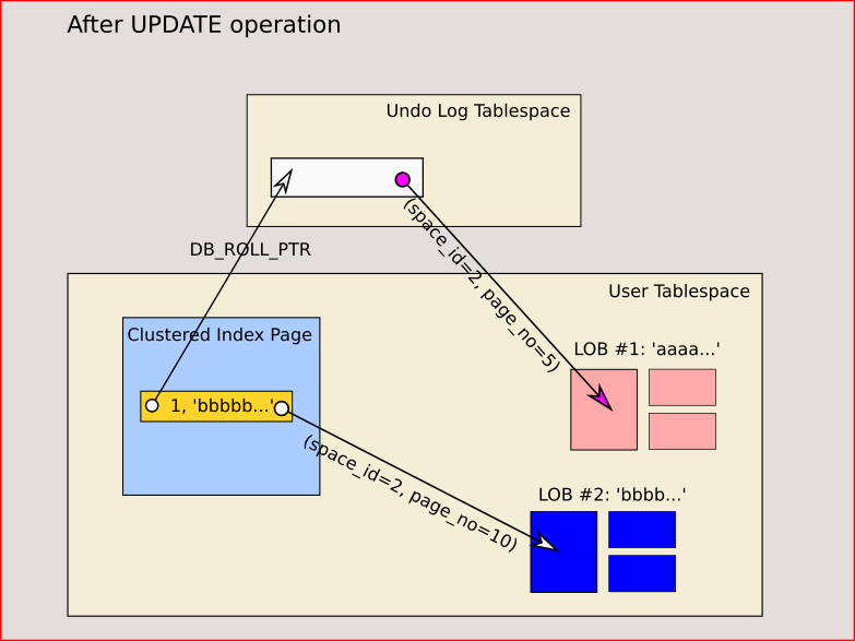 用户表空间中有两个LOB - 旧的LOB和新的LOB。 旧的LOB只能通过撤消日志访问。 聚集索引记录指向新LOB。