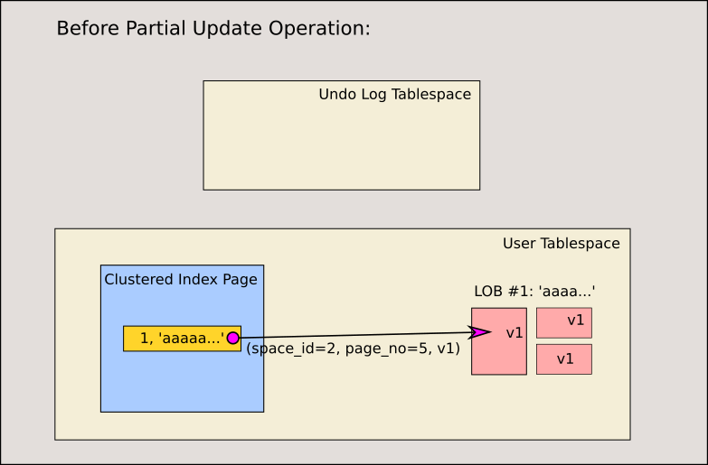 这里最重要的优化是用户表空间中仍然只有一个LOB。 仅更新需要修改的那些LOB数据页。 部分更新操作后的这个单个LOB包含旧版本和新版本的LOB。 图中LOB数据页面上的v1和v2标签说明了这一点。