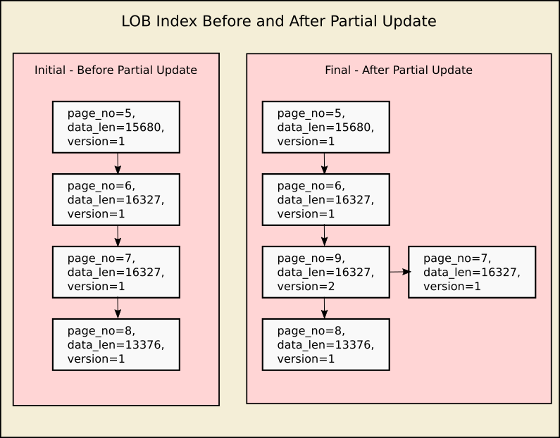 部分更新完成后,当通过版本号为2的LOB引用访问LOB时,将查看第5页的第一个索引条目。 它的版本号为1.如果索引条目中的版本号小于或等于LOB引用中的版本号,则将读取该条目。 因此它将按顺序读取页码5,6,9,8。 由于版本号始终<= 2,因此无需使用旧版本访问页码7。