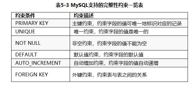 自增约束(AUTO_INCREMENT)可以使表中某个字段的值自动增加。一张表中只能有一个自增长字段,并且该字段必须定义了约束(该约束可以是主键约束、唯一约束以及外键约束),如果自增字段没有定义约束,数据库则会提示“Incorrect table definition; there can be only one auto column and it must be defined as a key”错误。