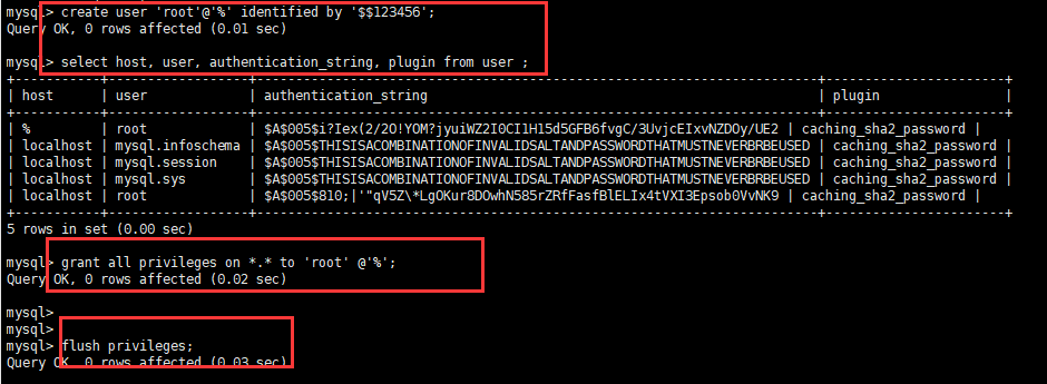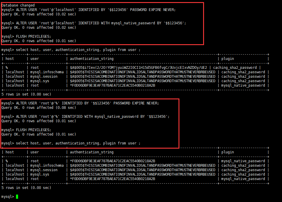 | localhost | mysql.infoschema | $A$005$THISISACOMBINATIONOFINVALIDSALTANDPASSWORDTHATMUSTNEVERBRBEUSED | caching_sha2_password |