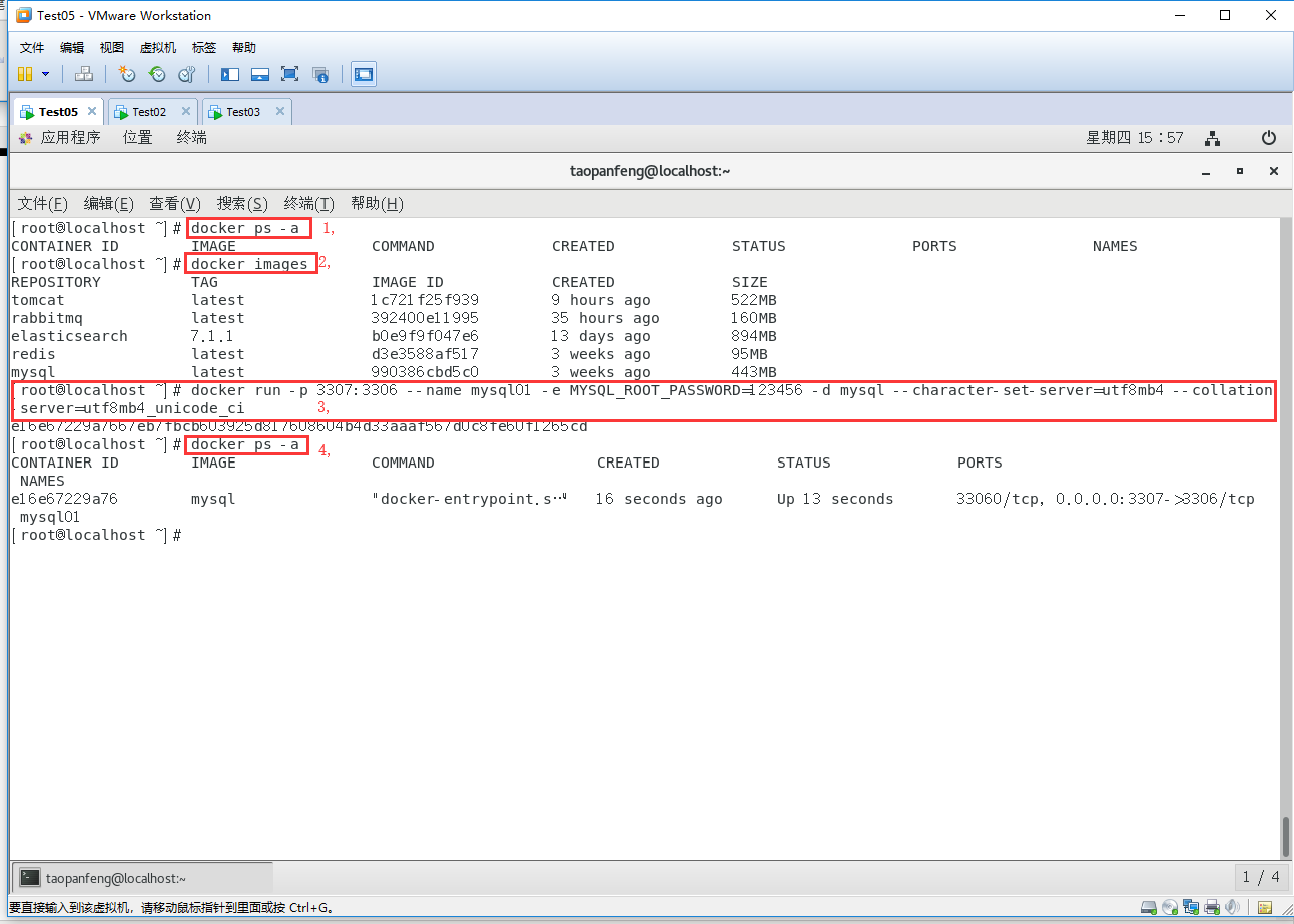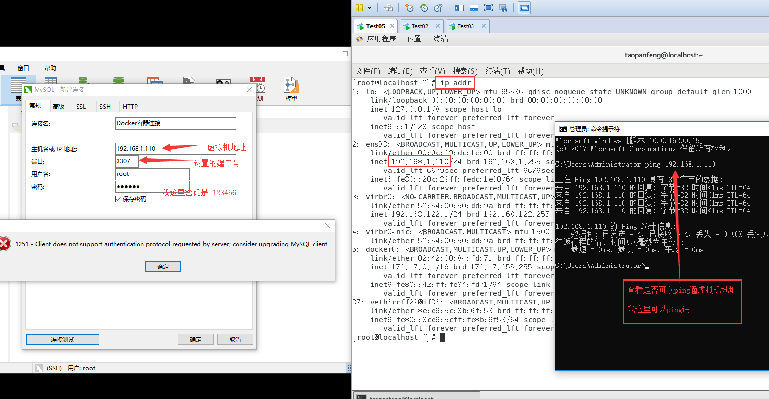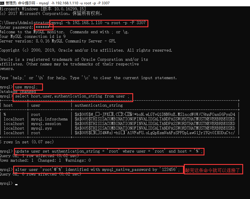 从上往下依次进行 命令1,登录 mysql 这里要把 192.168.1.110 换成你们自己的虚拟机 IP 地址,把3307端口号换成你们自己启动容器时设置的端口号 执行完之后,输入密码 mysql -h 192.168.1.110 -u root -p -P 3307 命令2,使用mysql use mysql; 命令3,查询 select host,user,authentication_string from user ; 命令4,更新 update user set authentication_string = 'root' where user = 'root' and host = '%'; 命令5,更新 把这里的 123456 换成你们设置的密码 alter user 'root'@'%' identified with mysql_native_password by '123456'; 输入完命令5就可以连接数据库了