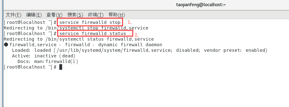 为了确保防火墙会对连接造成影响,我这里建议关闭防火墙 命令1,关闭防火墙 service firewalld stop 命令2,查看防护墙的状态 service firewalld status