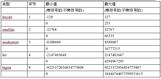 整数类型 字节 范围(有符号) 范围(无符号) 用途