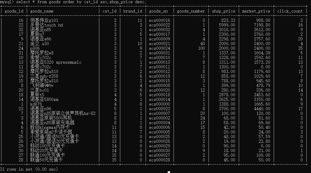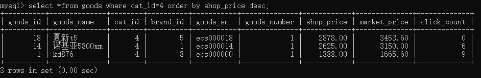 select *from goods where cat_id=4 order by shop_price desc; #desc 代表降序排列