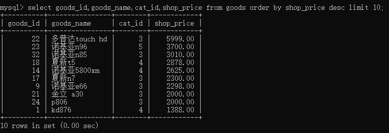 select goods_id,goods_name,cat_id,shop_price from goods order by shop_price desc limit 10;