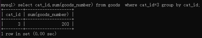 select cat_id,sum(goods_number) from goods where cat_id=3 group by cat_id;