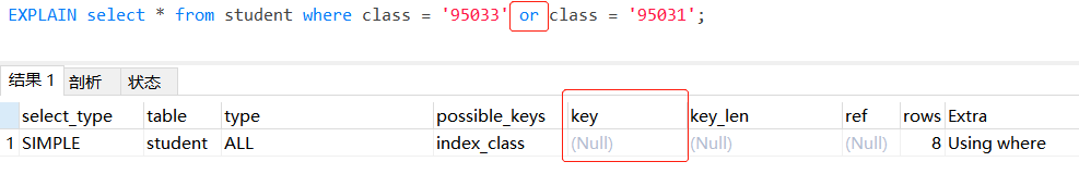 正确的例子:select * from test where id=10; 3.使用<>、not in、not exist、!= 会导致索引失效 4.查询条件包含or,会导致索引失效。