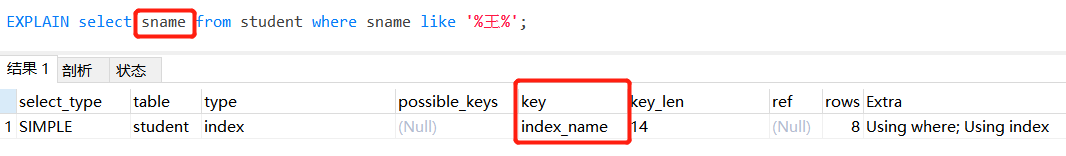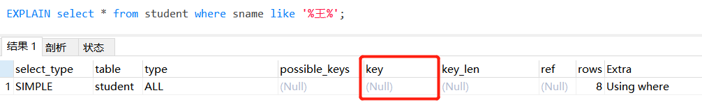 5.索引字段使用 like '%字符串%' 时,会导致索引失效而转向全表扫描。