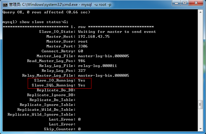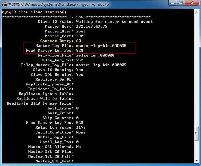 change master to master_host='192.168.43.75',master_port=3306,master_user='repl_user',master_password='123456',master_log_file='master-log-bin.000005',master_log_pos=155; # 这里的 master 日志文件和位置必须与主服务器当前状态一致!