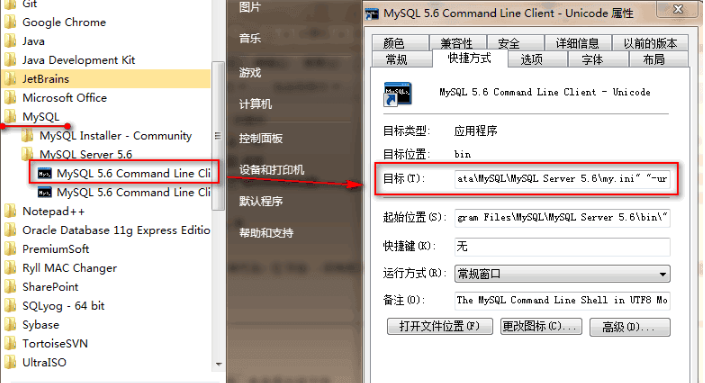 在“开始 → 所有程序 → MySQL”下面找到MySQL的命令行客户端工具,右键选择该命令行工具查看“属性”,在“目标”里面也可以看到MySQL使用的配置文件位置。