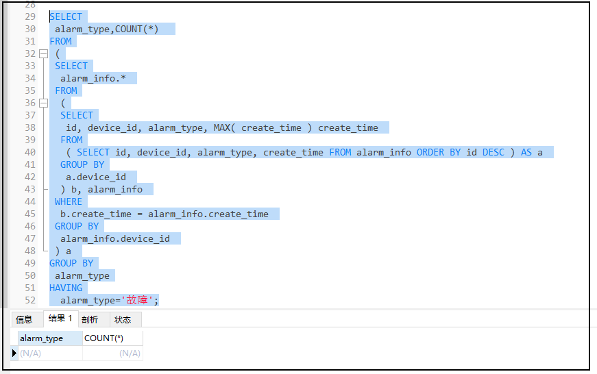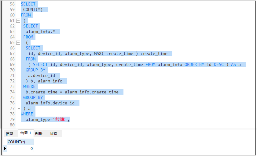 2.2 在子查询的基础上,不进行分组,直接统计每个状态的数量信息,可以得到正确结果,count如果没有查询到数据,则返回的默认值是0(火警的就不再演示)