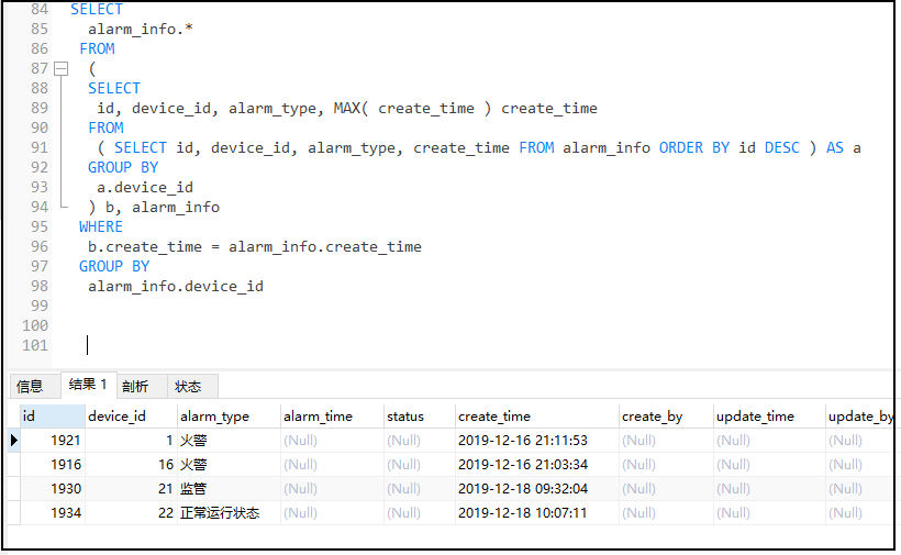 1. 首先子查询结果,可以看到每个设备最新的状态信息