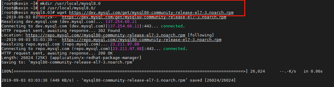 然后 创建目录,我一般软件放在 /usr/local 下,然后进入目录,下载:wget https://dev.mysql.com/get/mysql80-community-release-el7-3.noarch.rpm