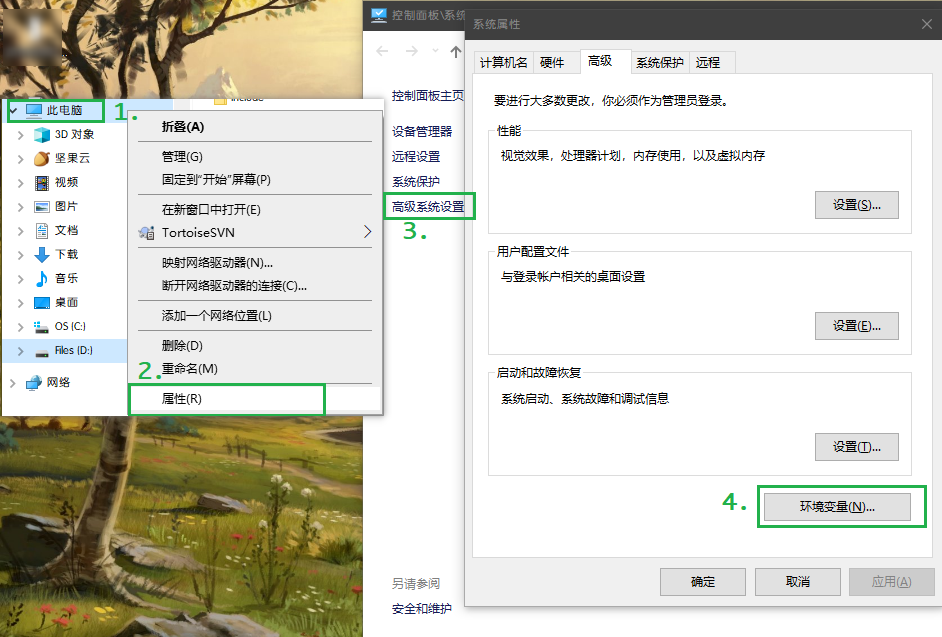 以此'此电脑'-->'属性'-->'高级系统设置'-->'环境变量'