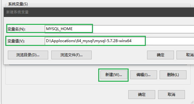 变量值:D:\Applocations\64_mysql\mysql-5.7.28-winx64(能看到bin目录的mysql解压路径)