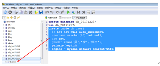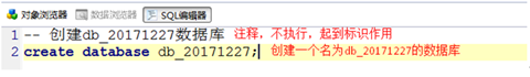 ② 在SQL编辑器中输入create database db_20171227;如下图所示: