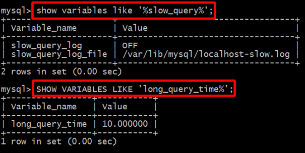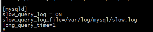 slow_query_log = ON slow_query_log_file = /var/log/mysql/slow.log long_query_time = 1