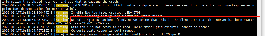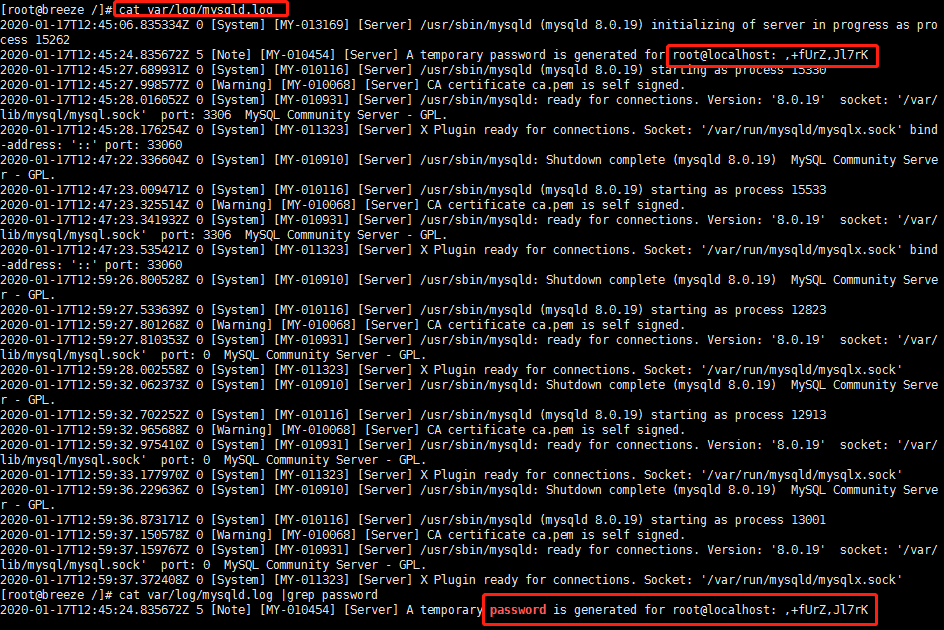 查看文档之后发现,mysql 在初次启动之后,会生成一个随机初始密码, 可以从日志中 筛选 到 , cat var/log/mysqld.log |grep password 就可以查询到当时的密码, 如图所示