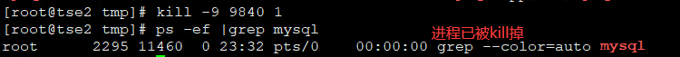 [root@tse2 tmp]# kill -9 9840 1 [root@tse2 tmp]# ps -ef |grep mysql