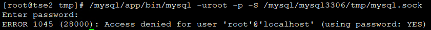 [root@tse2 bin]# mysqld_safe --deaults-file=/etc/my.cnf & [2] 6720 [root@tse2 bin]# 2020-01-16T02:55:45.223195Z mysqld_safe Logging to '/mysql/mysql3306/logs/error.log'. 2020-01-16T02:55:45.262302Z mysqld_safe A mysqld process already exists [2]+ Exit 1 mysqld_safe --deaults-file=/etc/my.cnf [root@tse2 bin]# mysql ERROR 1045 (28000): Access denied for user 'root'@'localhost' (using password: NO)