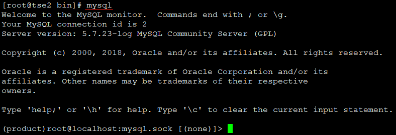 [root@tse2 bin]# mysql -uroot -p Enter password: Welcome to the MySQL monitor. Commands end with ; or \g. Your MySQL connection id is 4 Server version: 5.7.23-log MySQL Community Server (GPL) Copyright (c) 2000, 2018, Oracle and/or its affiliates. All rights reserved. Oracle is a registered trademark of Oracle Corporation and/or its affiliates. Other names may be trademarks of their respective owners. Type 'help;' or '\h' for help. Type '\c' to clear the current input statement. (product)root@localhost:mysql.sock [(none)]> use mysql Database changed (product)root@localhost:mysql.sock [mysql]> show databases; +--------------------+ | Database | +--------------------+ | information_schema | | mysql | | performance_schema | | sys | +--------------------+ 4 rows in set (0.01 sec)