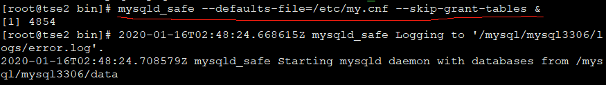 [root@tse2 bin]# mysqld_safe --defaults-file=/etc/my.cnf --skip-grant-tables & [1] 4854