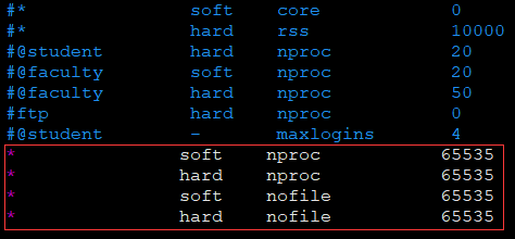 为了防止以上两种报错情况,我们可以修改系统的软硬限制。编辑/etc/security/limits.conf,加入限制的相关内容。记得更改完内容之后,需要重启操作系统才能生效。